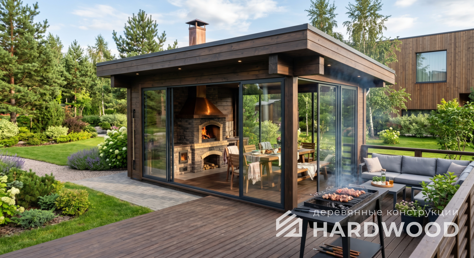 Закрытую или тёплую беседку с панорамным остеклением, продуманной вентиляцией и стабильной тягой. Добавьте тёплые полы/ИК-обогрев и получите «летнюю кухню», которой удобно пользоваться и в межсезонье.